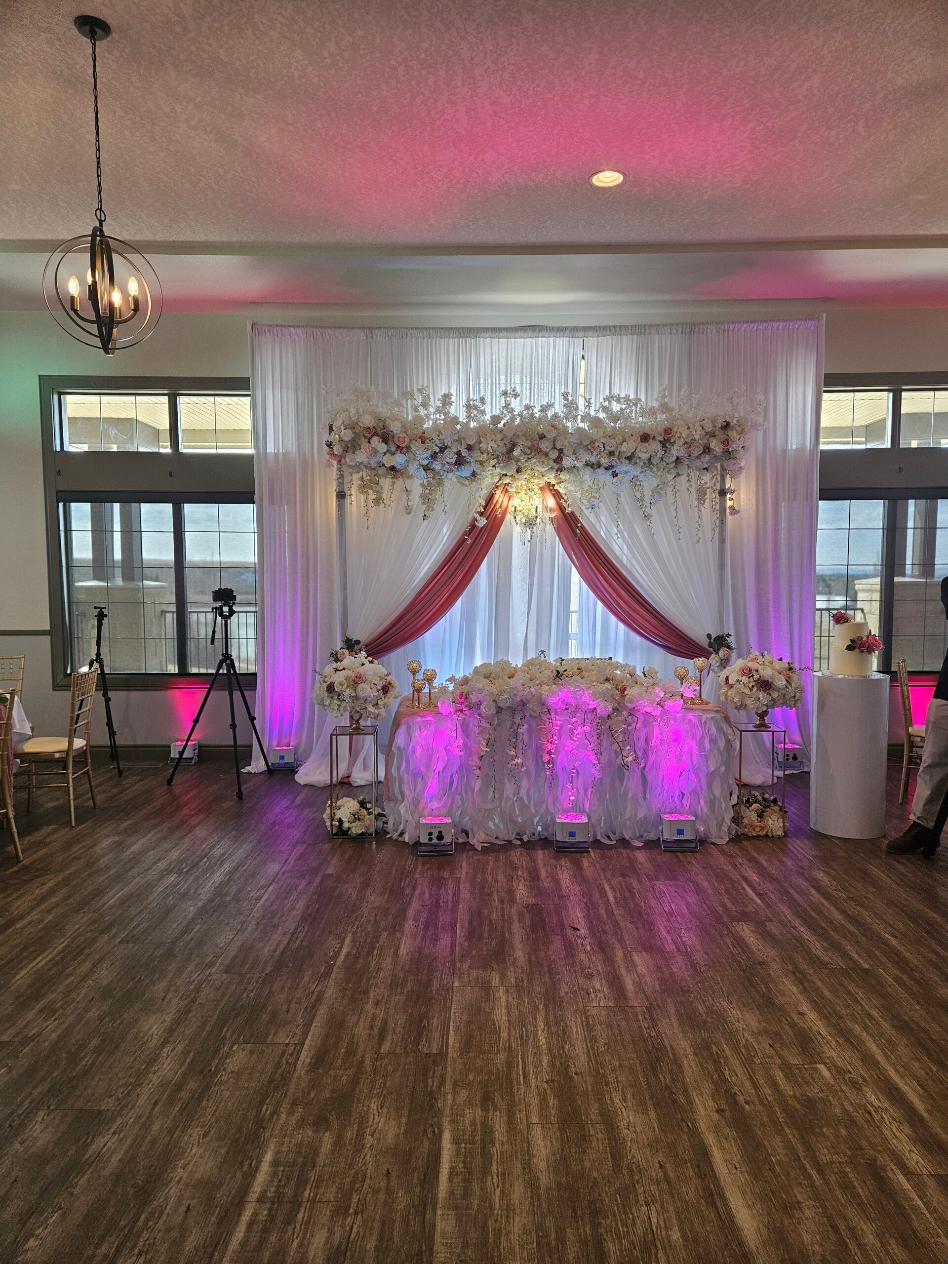 a stunning glow with color wash lighting across your reception.” & “Custom uplights designed to make your sweetheart table stand out.”
